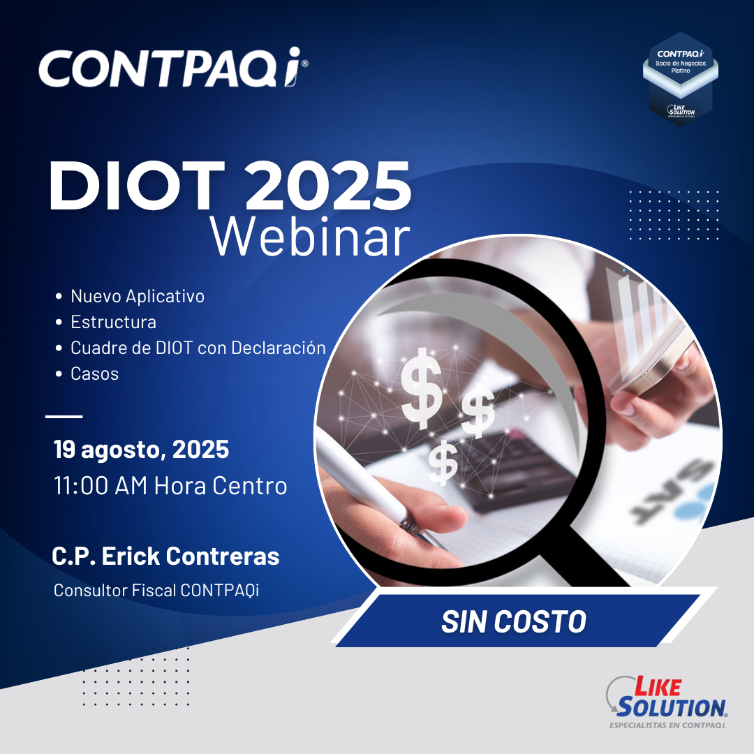 Prepárate para los cambios en la DIOT 2025. Participa en nuestro seminario gratuito donde explicaremos el nuevo aplicativo del SAT, su estructura y cómo cumplir correctamente con CONTPAQi® Contabilidad. 📅 19 de agosto | 🕚 11:00 a.m. | 💻 En línea | 💵 Sin costo 🔗 Regístrate aquí: https://bit.ly/Web_DIOT2025